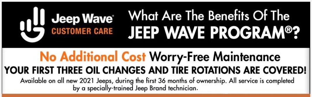 Your first three oil changes and tire rotations are covered during the first 36 months of ownership and all service is completed by a specially-trained Jeep® Brand technician at any Jeep dealership. Plus, Jeep Wave® is the Only Program with No Mileage Restrictions.